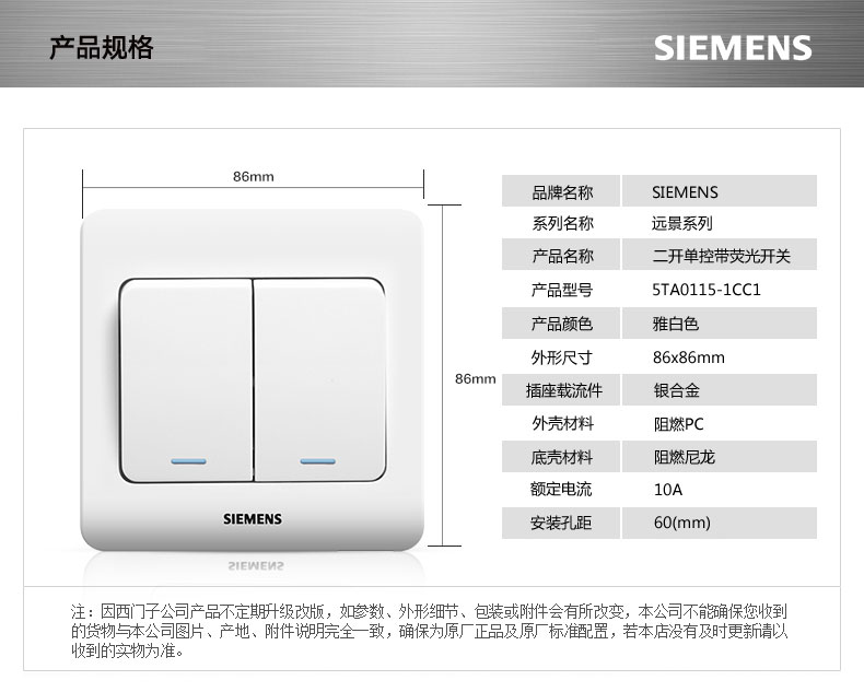 西门子(SIEMENS) 开关插座面板 远景系列雅白色二开单控(双开单控双联单控)带荧光