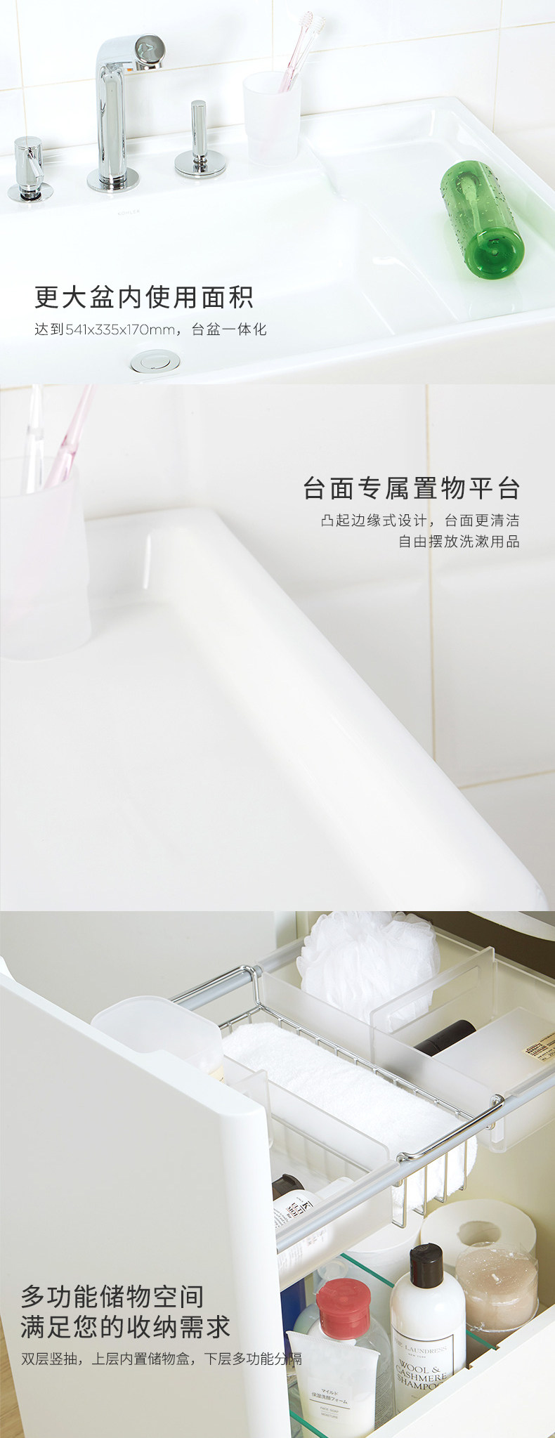 左中右独立储物空间设计,分区放置男士,女士梳洗用品及共用物件,物品放置独立有序,取用更方便